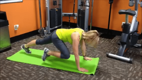 2. Mountain Climber: Starting on your hands and knees, bring the left foot forward directly under the chest while straightening the right leg. Keeping the hands on the ground and core tight, jump and switch legs. The left leg should now be extended behind the body with the right knee forward.